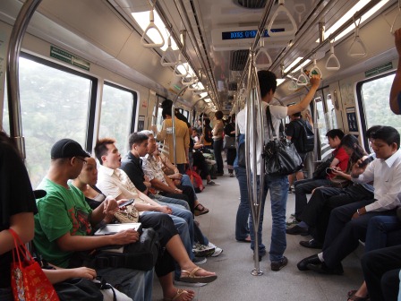 車廂裡面不少人 而且大家都穿得好清涼 因為這裡的冬天還是熱到爆阿